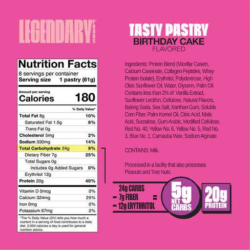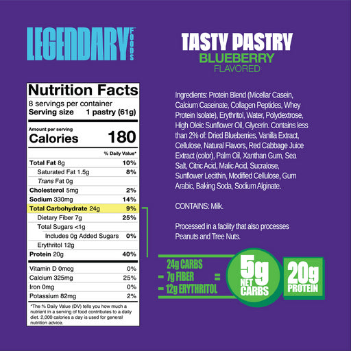 EAT LIKE A KID AGAIN! NOW WITH 15g PROTEIN 15g Protein, 4g Net Carbs, <1g Sugar, 4g fiber, 150 Calories, 7g Fat Legendary Foods Tasty Pastry...