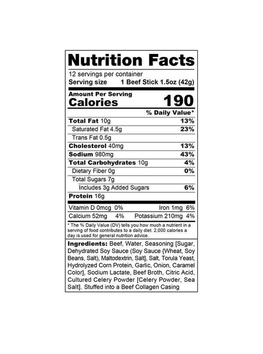 Our Beef Teriyaki Jerky Stick are so flavorful and tangy! Sugar, soy sauce, sesame seed oil all come together to make this the best tasting jerky s...